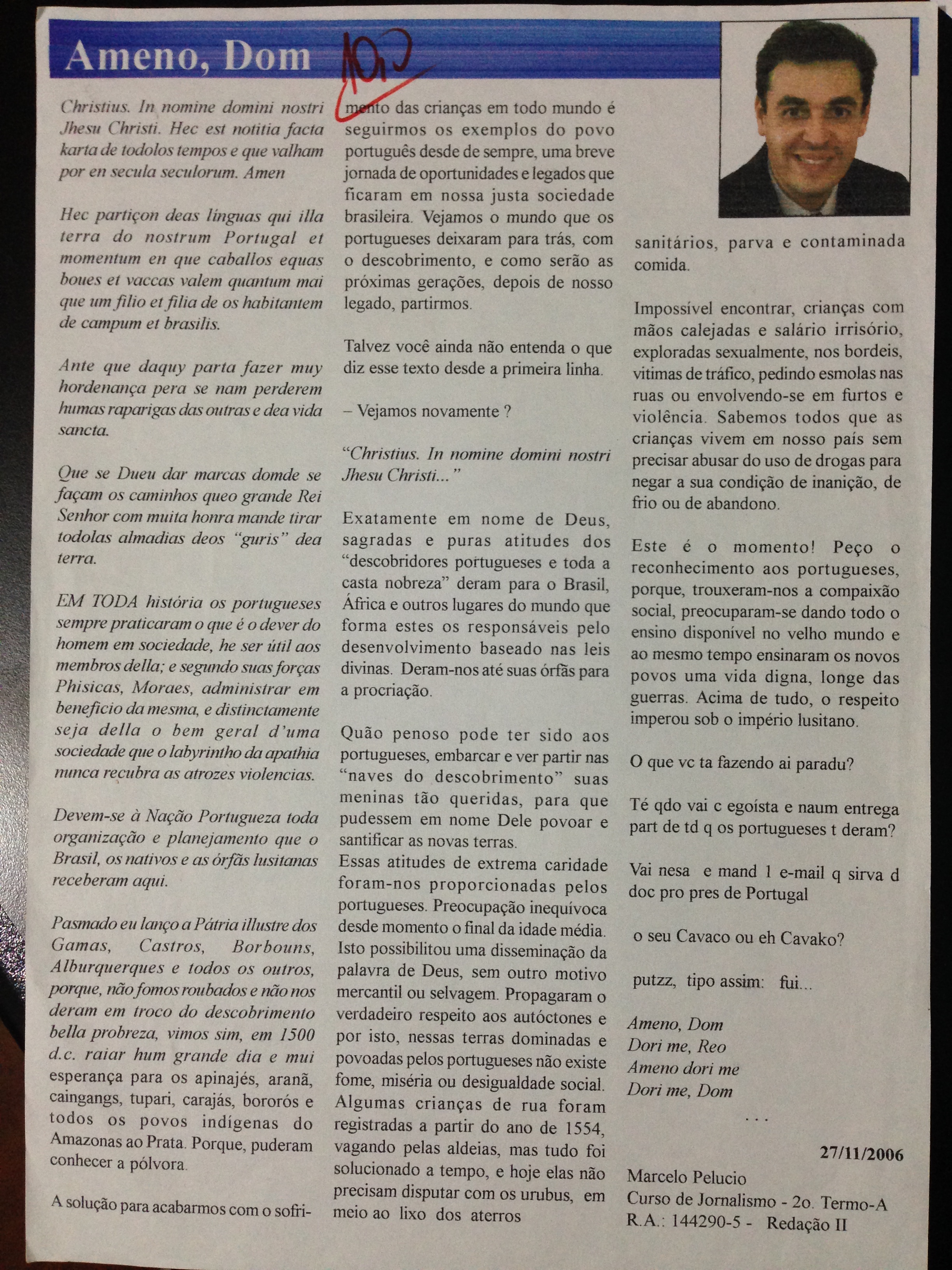 Hec partiçon deas línguas qui illa terra do nostrum Portugal et momentum em que caballos equas boues et vaccas valem quantum mai que um filio et filia de os habitantem de campum et brasilis.