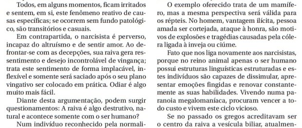 Em contrapartida, o narcisista é perverso, incapaz do altruísmo e de sentir amor. Ao defrontar-se com as decepções, sua raiva gera ressentimento e desejo incontrolável de vingança; trata este sentimento de forma implacável, inflexível e somente será saciado após o seu plano vingativo ser colocado em prática. Odiar é algo muito mais fácil.