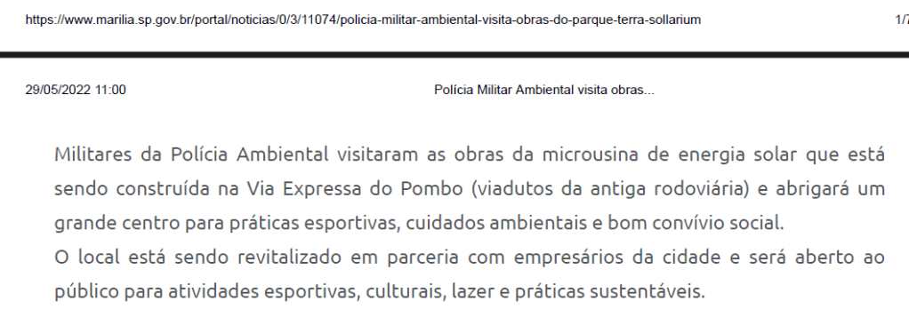 PARQUE TERRA SOLLARIUM DESTAQUE NO SITE DA PREFEITURA DE MARÍLIA